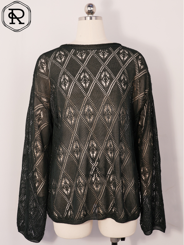 Dieses elegante Langarm-Top weist durchgehend ein aufwendiges Rautengitter-Pointelle-Muster auf. Der zarte, spitzenartige, offene Strick erzeugt eine transparente, romantische Textur, die Vintage-Inspiration mit modernem Stil vereint. Es verfügt über einen klassischen Rundhalsausschnitt und eine entspannte, gerade geschnittene Silhouette, die wunderschön fällt.